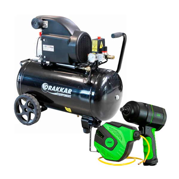 Combo de equipamiento formado por compresor 50 litros profesional, pistola de impacto JBM 1200nm y carrete de manguera 11 metros.