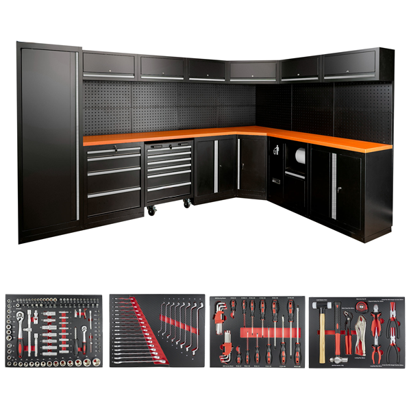 Conjunto modular completo de 24 piezas para taller con acabados en acero, que incluye varios tipos de armarios (altos, de pared, con puertas, con cajones), módulos de esquina, mesas de trabajo con tableros de MDF, paneles para herramientas, barras soporte y soporte para rollo de papel.