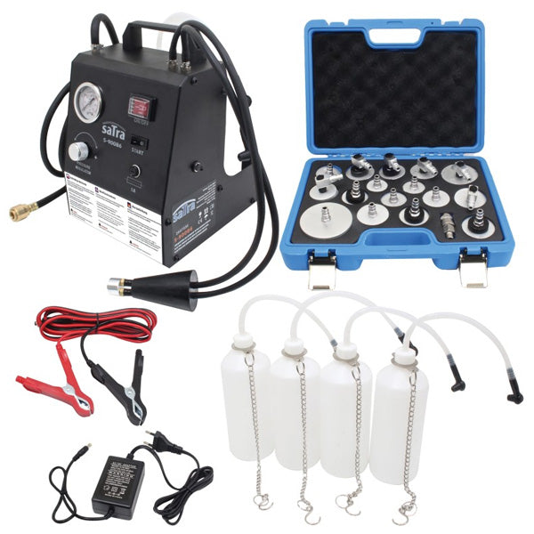 Kit disenyado para extraer el aire atrapado en el circuito de frenos mediante presión. Cuenta con un maletín con multiples adaptadores, apto para la gran mayoría de modelos.